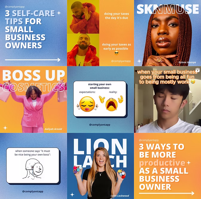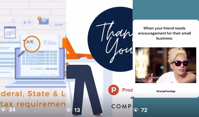 Content Strategy Shift: Revamped reel content to be less text and graphic heavy and more people focused. this marketing strategy increased ComplYant app's viewership by up to 1000%. We also steered away from small texts and stock images by creating more visually impactful posts that still stay cohesive. We also started using more gen-z meme formats to make our tax related comedic posts to be relatable.